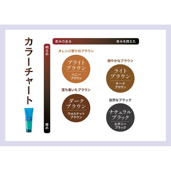 - 水、セテアリルアルコール、ステアルトリモニウムクロリド、ステアリルアルコール、ガゴメエキス、スサビノリエキス、ツボクサエキス、アカツメクサ花エキス、ウメ果実エキス、ソメイヨシノ葉エキス、アシタバ葉/茎エキス、ヘチマ果実/葉/茎エキス、ユズ果実エキス、オオムギ発酵エキス、アーチチョーク葉エキス、クチナシ果実エキス、ベニバナ花エキス、ムラサキ根エキス、ホホバ種子油、シア脂、アルガニアスピノサ核油、オリーブ果実油、オプンチアフィクスインジカ種子油、ヨーロッパキイチゴ種子油、オレンジ果皮油、コリアンダー果実油、ラベンダー油、ローズマリー葉油、ベルガモット果実油、ジャスミン油、ダマスクバラ花油、ティーツリー葉油、ウイキョウ果実油、加水分解コンキオリン、加水分解エンドウタンパク、加水分解ダイズエキス、コーヒー種子エキス、コメヌカスフィンゴ糖脂質、スフィンゴ糖脂質、水添レシチン、トリ(カプリル酸/カプリン酸)グリセリル、γ-ドコサラクトン、グリセリン、グリチルリチン酸2K、シクロヘキサン-1,4-ジカルボン酸ビスエトキシジグリコール、水添ナタネ油アルコール、ステアリン酸グリコール、ヒドロキシエチルセルロース、ポリクオタニウム-7、トコフェロール、クエン酸、クエン酸Na、炭酸水素アンモニウム、クロルヒドロキシAl、DPG、イソペンチルジオール、ペンチレングリコール、イソプロパノール、エタノール、BG、フェノキシエタノール、安息香酸Na、(+/-)塩基性茶16、塩基性青99、HC青2、HC黄4、塩基性黄87、塩基性橙31、HC青16