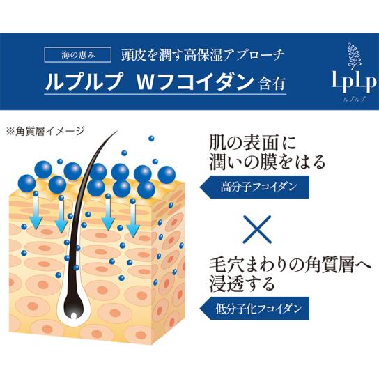 高分子と低分子化した2種類のフコイダンを組み合わせた、ルプルプ独自の保湿成分「ルプルプWフコイダン」。高分子フコイダンが頭皮の表面を潤いで満たしてやわらかく整え、低分子化フコイダンが頭皮や毛穴まわりの角質層に浸透して、健やかな頭皮環境導きます。