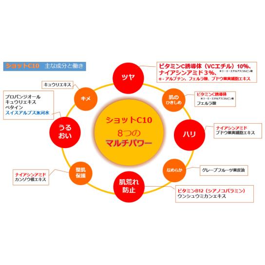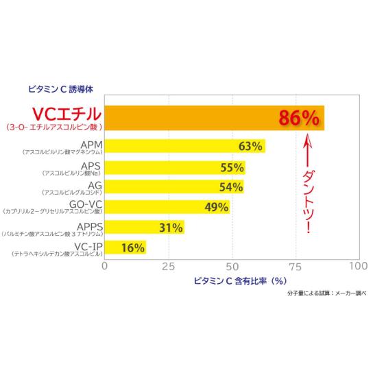 1本の中にビタミンC誘導体(VCエチル:3-Oエチルアスコルビン酸)を10%と高配合!ビタミンCの威力を最大限発揮するために、即効型ビタミン誘導体VCエチルを配合。ビタミンCを角質層に行き渡らせる選び抜かれた成分です。また、VCエチルは誘導体の中で1番ビタミンCの含有量が多いのも特長です。