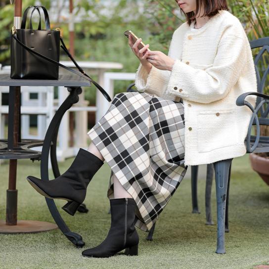 トレンドのスクエアトゥはつま先にゆとりがあり、ワイズは4E程度とゆったり幅広ながら美しいフォルムを実現。太く安定感あるチャンキーヒールは特徴的な台形のカッティングで細見えに。高さ6cmでありながら、その高さを感じさせない安定感ある履き心地が同居する絶妙ヒール。ミドル丈はシュッと脚に沿うスッキリとしたラインで大人の上品さを演出します。