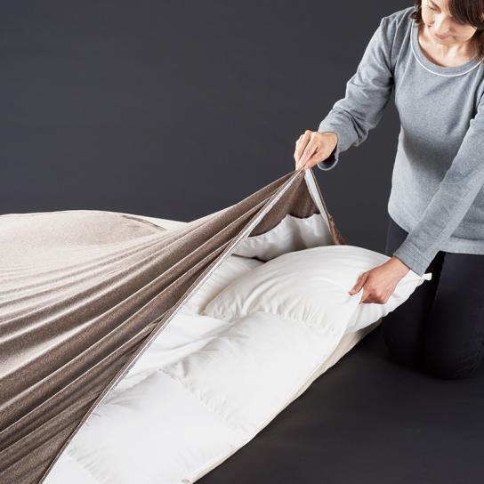 この1枚が、毛布と布団、布団カバーの3役を兼ね備え、1枚で調節が可能。1枚でも充分に暖かいのですが、さらに寒さを感じる方は、中に布団を入れればさらに暖か!掛け布団と毛布が一体化することで、毛布と布団がずれることも、何枚も毛布を重ねた際に感じる重みもありません。