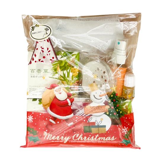 大人気の美肌せっけんをXmasラッピングでお届け!ミニ美肌石けん、ミニ用石けんケース、化粧水と美容液のミニボトル付き!プレゼントにはもちろん、百香草シリーズをお試ししたい方におすすめ!