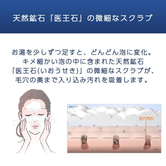 15秒パック後、お湯を少しずつ足すことで密着していたモイスチャークリームがどんどん泡に変化。キメ細かい泡の中に含まれた天然鉱石「医王石(いおうせき)」の微細なスクラブが、毛穴の奥まで入り込み汚れを吸着します。