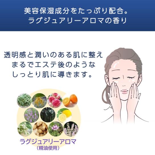 しっかり汚れを取ったあとは、たっぷりの美容保湿成分と潤いベールでお肌を包み込むリピジュア®*などを配合しており、透明感と潤いのある素肌に整え、まるでエステ後のようなしっとり肌に導きます。