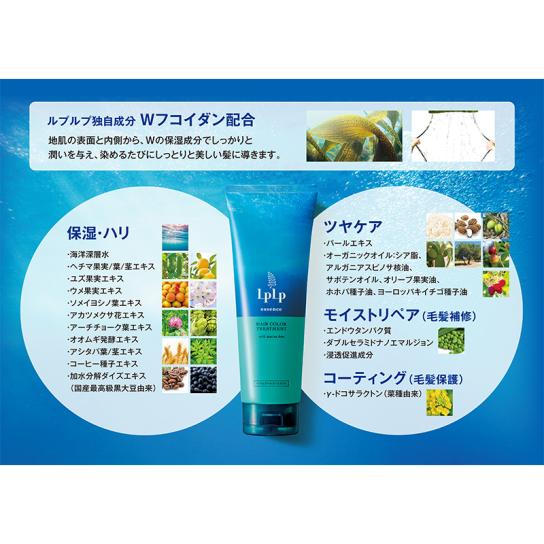 - 水、セテアリルアルコール、ステアルトリモニウムクロリド、ステアリルアルコール、ガゴメエキス、スサビノリエキス、ツボクサエキス、アカツメクサ花エキス、ウメ果実エキス、ソメイヨシノ葉エキス、アシタバ葉/茎エキス、ヘチマ果実/葉/茎エキス、ユズ果実エキス、オオムギ発酵エキス、アーチチョーク葉エキス、クチナシ果実エキス、ベニバナ花エキス、ムラサキ根エキス、ホホバ種子油、シア脂、アルガニアスピノサ核油、オリーブ果実油、オプンチアフィクスインジカ種子油、ヨーロッパキイチゴ種子油、オレンジ果皮油、コリアンダー果実油、ラベンダー油、ローズマリー葉油、ベルガモット果実油、ジャスミン油、ダマスクバラ花油、ティーツリー葉油、ウイキョウ果実油、加水分解コンキオリン、加水分解エンドウタンパク、加水分解ダイズエキス、コーヒー種子エキス、コメヌカスフィンゴ糖脂質、スフィンゴ糖脂質、水添レシチン、トリ(カプリル酸/カプリン酸)グリセリル、γ-ドコサラクトン、グリセリン、グリチルリチン酸2K、シクロヘキサン-1,4-ジカルボン酸ビスエトキシジグリコール、水添ナタネ油アルコール、ステアリン酸グリコール、ヒドロキシエチルセルロース、ポリクオタニウム-7、トコフェロール、クエン酸、クエン酸Na、炭酸水素アンモニウム、クロルヒドロキシAl、DPG、イソペンチルジオール、ペンチレングリコール、イソプロパノール、エタノール、BG、フェノキシエタノール、安息香酸Na、(+/-)塩基性茶16、塩基性青99、HC青2、HC黄4、塩基性黄87、塩基性橙31、HC青16