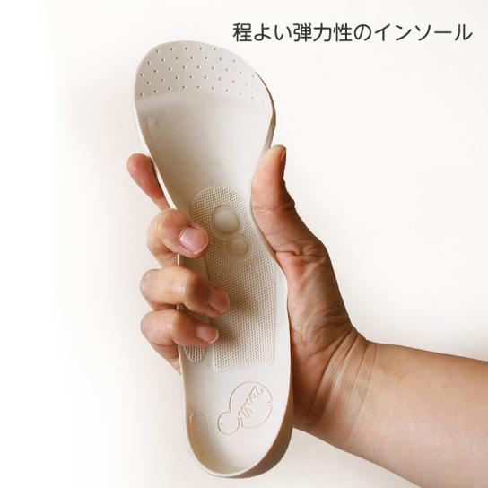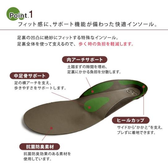歩きやすさのヒミツは、サポート機能搭載のインソール。5つの機能で足裏全体を隙間なく支えて優しいフィット感を生み出しているので、履き心地よく、歩く時の負担を軽減します。