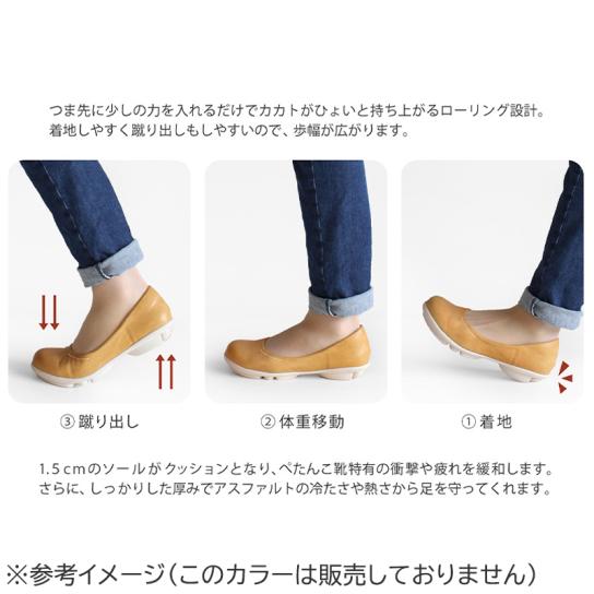 さらに、屈曲性に優れているため足への負担が軽減。歩きやすさをサポートするソール前後それぞれのカットにより、着地からつま先の蹴り出しが自然とラクに行える「ローリング歩行」へと導いてくれます。