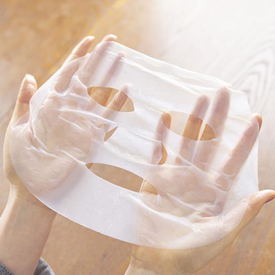 一般的な不織布の約300分の1※のナノ繊維でできた「バイオセルロース」を採用。ヤシの実由来の天然素材で、ナタデココのような弾力感と高い密着性が特長。美容成分をしっかり肌に届け、うるおいを逃しません。