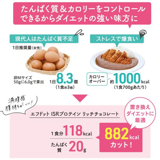 「プロテイン=運動する人のもの」と思われがちですが、タンパク質は筋肉・血液・髪・爪・骨などを作る重要な栄養素。現代人は食事だけでは不足しがちで、特に女性は意識的な摂取が必要です。エフドットISRプロテインは、1食でタンパク質20g・118kcalを摂取でき、置き換えダイエットや間食代わりにもぴったり。美容・健康・栄養を1つで叶える、オールインワン美容食です。