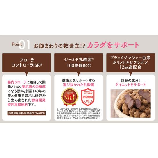 腸内環境を整える特許取得成分「フローラコントローラ ISR(※)」をはじめ、選び抜かれた「シールド乳酸菌」を100億個配合。さらに、話題のブラックジンジャー由来成分「ポリメトキシフラボン」も配合し、内側から美と健康をサポートします。