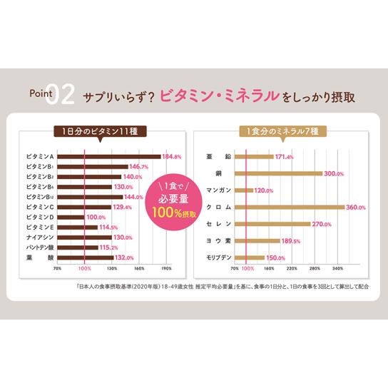 1食で、ビタミン・ミネラルの必要量を100%カバー。ホエイ&ソイのWプロテインで、即効性と持続性を両立。ホエイは必須アミノ酸「BCAA」が豊富で吸収がスムーズ、ソイは満腹感が持続しやすく、女性に嬉しいイソフラボンも含まれています。