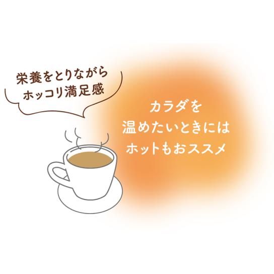 甘さ控えめでカカオの深みを感じるリッチチョコレート風味。水でスッキリ、牛乳や豆乳でコクと風味がアップ。ホットでも美味しく、朝食・運動後・間食・お休み前など、さまざまなシーンで活躍します。