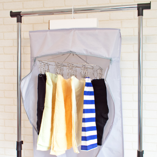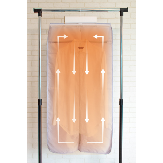 付属の衣類カバーとラックを使えば、Yシャツや厚手のトレーナーなど最大3着まで乾燥可能!温風がカバー内で循環することで効率的に乾かしてくれます。目安として、ポリエステル素材のTシャツは約30分、綿素材の長袖シャツは約120分で乾きます。(*1)