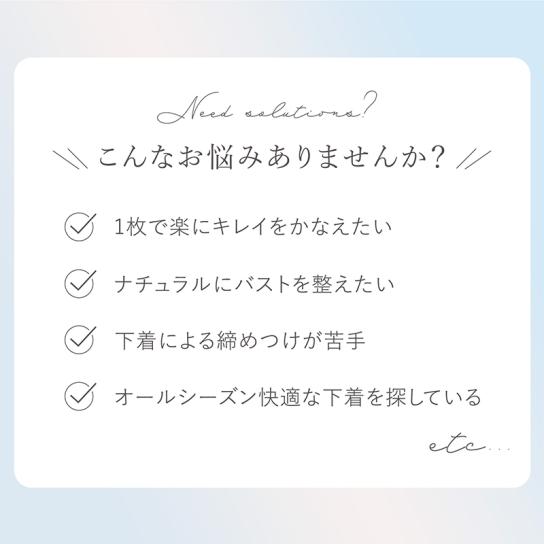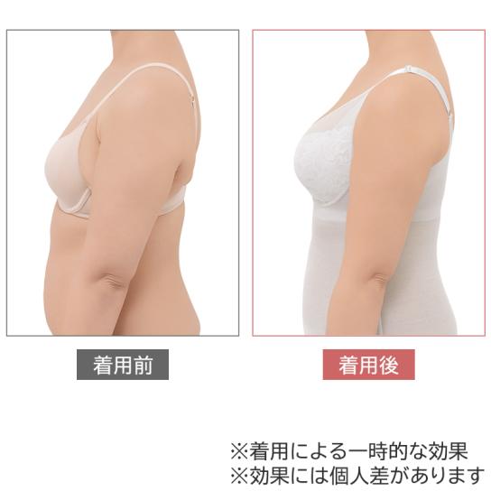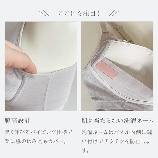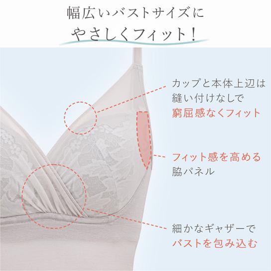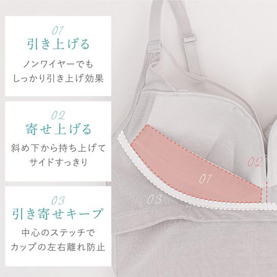 ワイヤーなしでもバストをしっかり引き上げて整える独自構造を採用。カップ部分は持ち上げて寄せる3段階の厚みがあり、デコルテまでふっくらとした印象に。また、脇高設計で気になる脇のお肉もすっきり。ラクな着心地なのに、自然で若々しいシルエットを演出します。 -