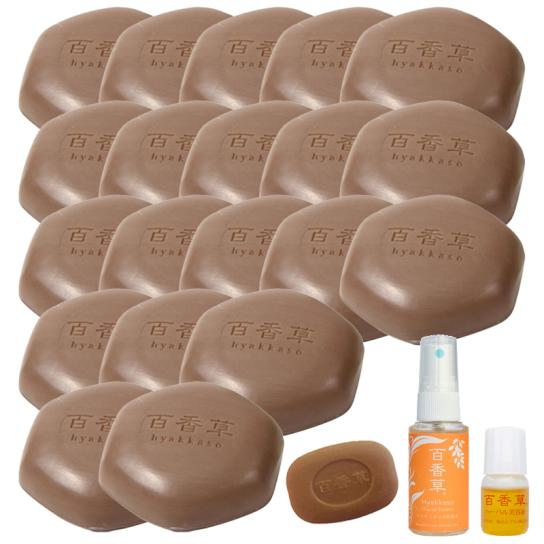 石ケン素地、バクハン石、木酢液、ドクダミエキス、シャクヤクエキス、甘草エキス、オウバクエキス、キョウニンエキス、オタネニンジンエキス、トウニンエキス、アロエベラエキス、カワラヨモギエキス、トウキエキス、ウイキョウエキス、オウレンエキス、カッコンエキス、クチナシエキス、ウヤクエキス、センキュウエキス、シコンエキス、サンザシエキス、ビャクダン油、グリセリン、オリーブ油、水