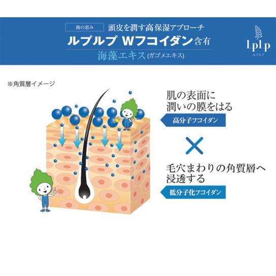 LPLPの代表的な美容保湿成分「ルプルプ Wフコイダン」を配合。ガゴメ昆布から抽出したネバネバ成分「フコイダン」由来の成分です。高分子と低分子化した2種類のフコイダンが髪や頭皮の表面と角質層の隅々にしっかり潤いを与えてくれます。美容保湿成分がたっぷり配合されているリンスインシャンプーなのでトリートメント不要。色落ちを防ぐためにも洗い流す回数も1回で済みます。