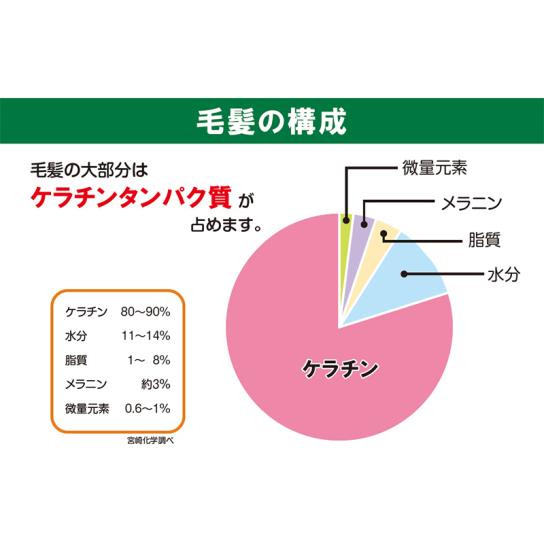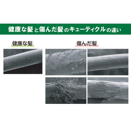 頭皮、毛髪に潤いを与えてくれる成分を高濃度で配合。髪の大部分はケラチンタンパク質でできています。ケラチンタンパク質は、髪を外部の刺激から守り、水分が失われないようにして、さらにツヤを与えてくれます。髪がダメージを受けるとキューティクルが開き、乾燥などで髪に刺激を与え続けるとキューティクル(タンパク質)がはがれやすくなります。ドライヤーなどで熱や刺激を加えすぎた髪はダメージを受けて水分やタンパク質が失われ、自分の力で補修することが難しくなります。