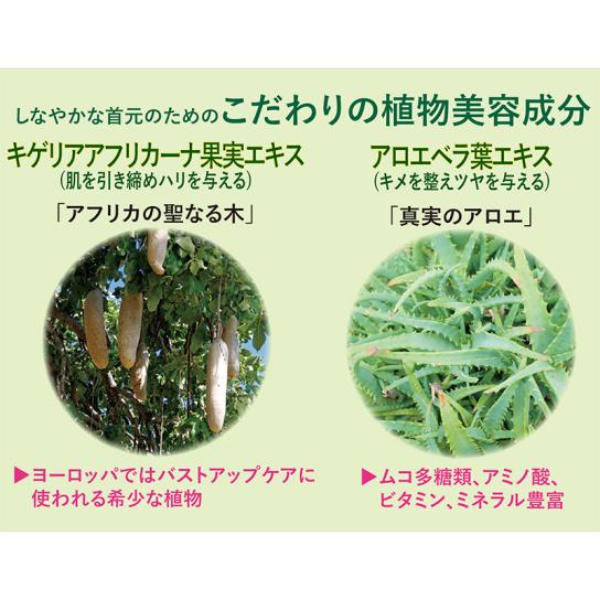 カッパエラスチンと相性の良いアスタキサンチン、トマト果実エキス、ビタミンB12が気になるネックラインを引き締めてハリを与え、フランスのエステサロンなどでバストアップケアに使われる成分キゲリアアフリカーナ果実エキス、アロエベラ葉エキスがみずみずしいお肌に整えてくれます。ほかにも、ツヤや輝きを与えるクエン酸、ビタミンEなども配合しています。