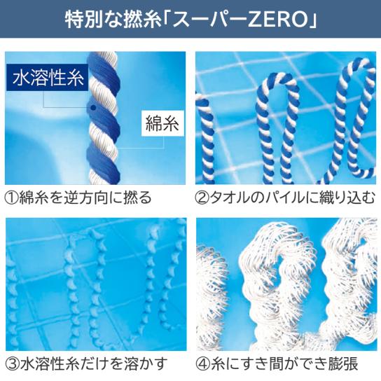 高吸水・ふわふわの秘密は特別な撚糸「スーパーZERO」。「スーパーZERO」は、綿の糸と水溶性糸をねじり合わせた後、お湯に浸して水溶性の糸だけを溶かした撚糸です。