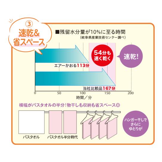横幅がバスタオルの半分ながら、全身を拭ける吸水量!ハンガーで干せるので、洗濯の量・干す場所も半分に。