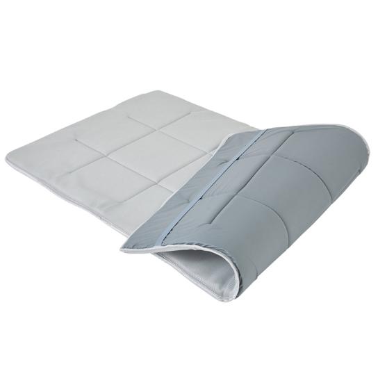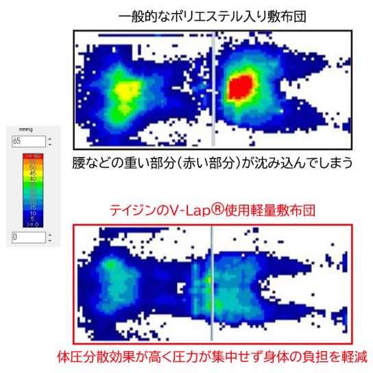 弾力性・通気性・軽量を兼ねそろえた帝人の高機能素材「V-Lap®」を使用。厚みは5cmと薄くても、高反発なので腰など重たい部分も沈み込まず、真っ直ぐな姿勢で体の負担を軽減します。耐圧分散効果が高く、圧力が集中しないので寝返りもしやすく、しっかりと身体を支えてくれます。柔らかい布団だと腰に負担がかかるのが気になるご年配の方にもおすすめ。
