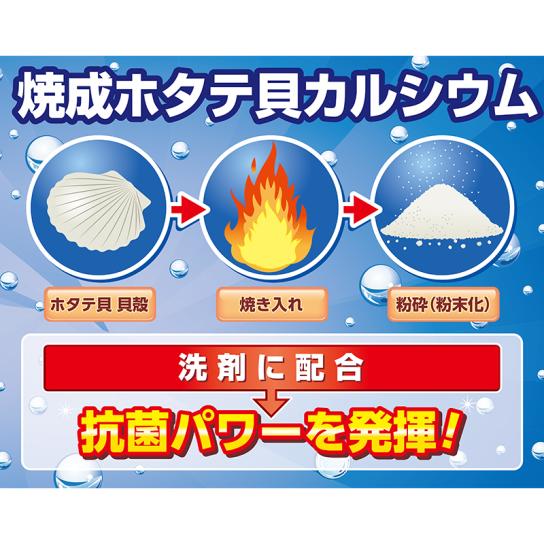 - 界面活性剤(0.5%ポリオキシアルキレンアルキルエーテル)、アルカリ剤、水軟化剤、分散剤、再汚染防止剤(カルボキシメチルセルロース)、酵素、植物性脂肪酸、消臭抗菌成分