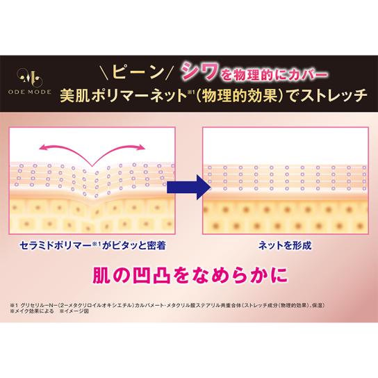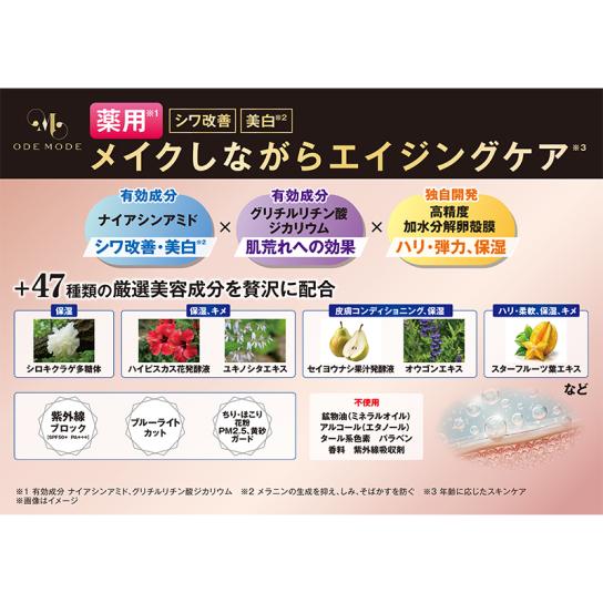 シワ改善・シミ予防をサポートする有効成分を配合し、メイク効果でカバーしながら、透明感のあるツヤ肌を演出します。