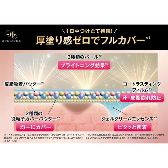 【その他の成分】加水分解卵殻膜、シロキクラゲ多糖体、加水分解ヒアルロン酸、ヒアルロン酸ヒドロキシプロピルトリモニウム、加水分解コラーゲン末、水溶性コラーゲン液N、サクシニルアテロコラーゲン液、加水分解シルク液、N-ステアロイルフィトスフィンゴシン、植物性スクワラン、マカデミアナッツ油、加水分解コンキオリン液、セイヨウナシ果汁発酵液、ハイビスカス花発酵液、ユキノシタエキス、ハトムギ発酵液、アスパラサスリネアリスエキス、ムラサキシキブ果実エキス、海藻エキス(1)、カモミラエキス(1)、ヒメフウロエキス、ドクダミエキス、ローヤルゼリーエキス、ツボクサエキス、ゲンチアナエキス、パウダルコ樹皮エキス、サンゴ草抽出液、スターフルーツ葉エキス、ニンジンエキス、アーティチョークエキス、天然ビタミンE、ウメ果実エキス、オウバクエキス、グリセリル-N-(2-メタクリロイルオキシエチル)カルバメート・メタクリル酸ステアリル共重合体、アルモンドエキス、ヒアルロン酸ナトリウム(2)、ビルベリー葉エキス、オウゴンエキス、濃グリセリン、ジグリセリン、精製水、デカメチルシクロペンタシロキサン、メチルフェニルポリシロキサン、メチルシロキサン網状重合体、メチルポリシロキサン、架橋型メチルポリシロキサン、1,3-ブチレングリコール、1,2-ペンタンジオール、ポリエチレングリコール1500、微粒子酸化チタン、雲母チタン、水酸化アルミニウム、無水ケイ酸、セリサイト、酸化チタン、酸化アルミニウム、軽質炭酸カルシウム、アクリル酸アルキル共重合体メチルポリシロキサンエステル、ヘキサメチレンジイソシアネート/トリメチロールヘキシルラクトン架橋ポリマー、2-オクチルドデカノール、パルミチン酸2-エチルヘキシル、イソステアリン酸、ステアリン酸、トリイソステアリン酸ジグリセリル、ポリオキシエチレン・メチルポリシロキサン共重合体、ステアリン酸亜鉛、グリセリンモノ2-エチルヘキシルエーテル、ジメチルジステアリルアンモニウムヘクトライト、d-δ-トコフェロール、クエン酸ナトリウム、フェノキシエタノール、黄酸化鉄、ベンガラ、黒酸化鉄