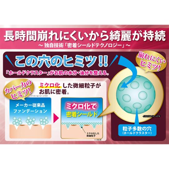 また、パウダーには「ホールドクラスター」という無数の穴が空いているものも入っており、皮脂や水分を吸着し、ピタッと肌になじんで崩れにくく、美しさを長時間キープします。