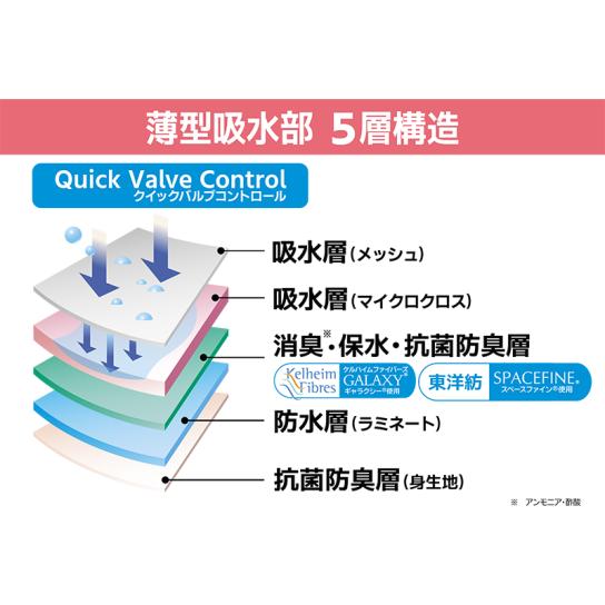吸水部3層目には、日本の大手繊維メーカーの東洋紡スペースファイン【R】と、ドイツの繊維メーカーケルハイムファイバーズ社のギャラクシー【R】の混合わたを使用。優れた吸水性だけでなく、気になるニオイにも対応していて、アンモニアだけでなく、汗の臭いや加齢臭の消臭性能も発揮してくれます。
