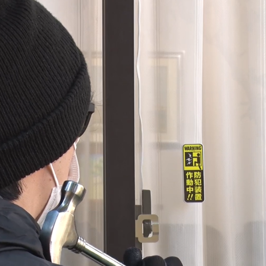 窓ガラスが割れたり、金属で叩かれた時に反応し、約90dBの警報音が約25秒間鳴り響きます。音で周囲に知らせ、侵入を防ぐ抑止力につながります。