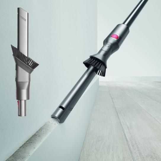 ダイソン独自のモーターによる強力な吸引力と、床にしっかり密着する「フラフィヘッド」で、細かなホコリから食べこぼしなどの大きなゴミまでしっかり吸引します。毛が絡みにくい設計で、壁際や畳の目地もきれいに掃除可能。フローリングや畳など、さまざまな床に対応し、快適な掃除を実現します。