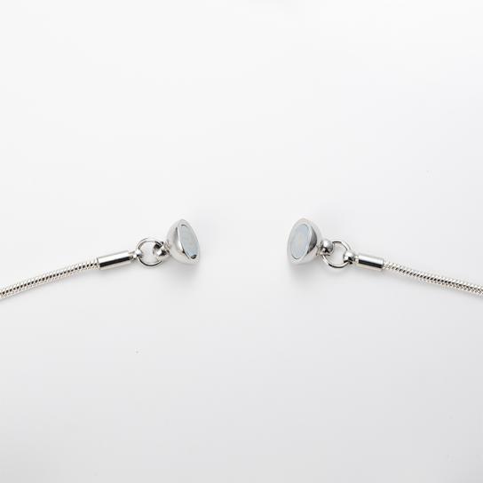 完全オリジナルのデザインで、素材の組み合わせにこだわり、顔まわりを美しく引き立てる工夫を凝らしました。留め具にはマグネットを採用し、使いやすさも追求しています。