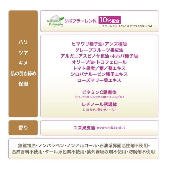 さらに、フラーレンはビタミン類と相性が抜群。ハリを与える「ビタミンC誘導体」や「レチノール誘導体」も配合することで、リポフラーレンNの働きを際立たせてくれます。その他、ヒマワリやアンズ、グレープフルーツ、ホホバといった植物由来のオイルを配合し、乾燥で硬くなった大人肌に上質な潤いを与えます。