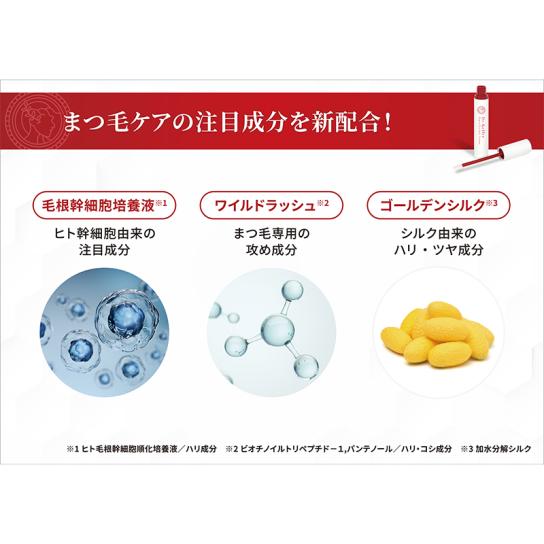 ヒト毛根幹細胞培養液、ワイルドラッシュ、ゴールデンシルクを新配合。さらにキャピキシル、アナルジー、ピディオキシジルも加え、まつ毛の土台を整えるケアをサポートします。