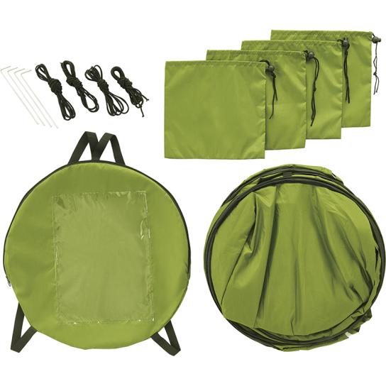 薄型で収納しやすく、設営は簡単。内側はアルミ素材で透けにくく、ファスナー付きで使いやすい仕様。高さがあるため窮屈感なく利用できます。収納も簡単で、収納袋に収まります。砂袋とピックも付属し、風対策も可能です。