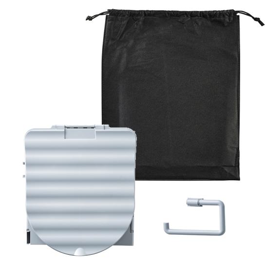 コンパクトながら簡単に組み立て可能。洗える素材で繰り返し使用でき、持ち運びに便利な収納袋付き。トイレットペーパーホルダーも付属しています。