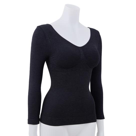 ノンワイヤーながら、左右のパッドをつなげた「コネクティングパッド」がバストを寄せ上げ、自然で若々しいラインに。9分袖でアウターにも響きにくく、伸縮性のある素材で快適な着心地です。 -