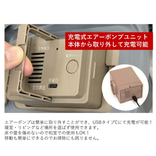 エアーポンプは取り外して充電できるコードレスタイプ。使用時はコンセントにつながずに使えるため、リビング・寝室・和室など幅広い場所で利用できます。空気を抜くと元の状態に戻るので、敷布団の下に敷いてそのまま寝ても大丈夫。また、使わない時は空気を抜いてコンパクトに収納できるのもうれしいポイント◎