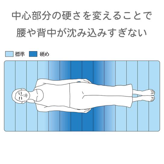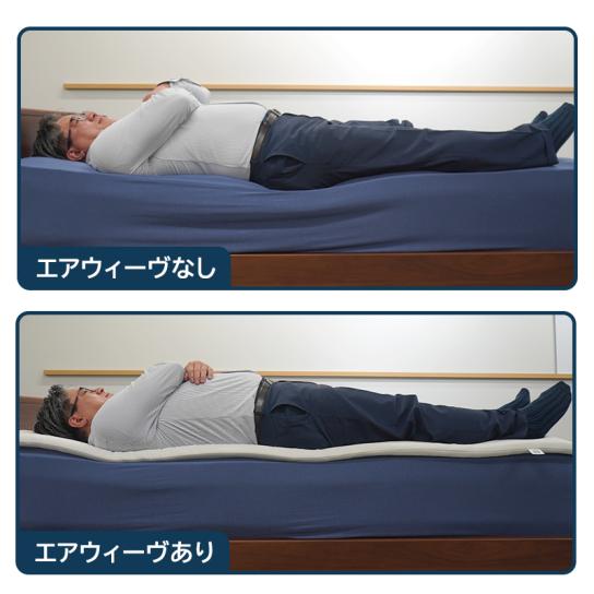 エアウィーヴ独自素材「エアファイバー®」が、体圧を分散し、寝返りもスムーズに。背中~腰部分は硬めに設計されており、肩は沈み、腰はしっかり支えることで胸が開き、呼吸がラクに。横向き寝の方にもおすすめです。