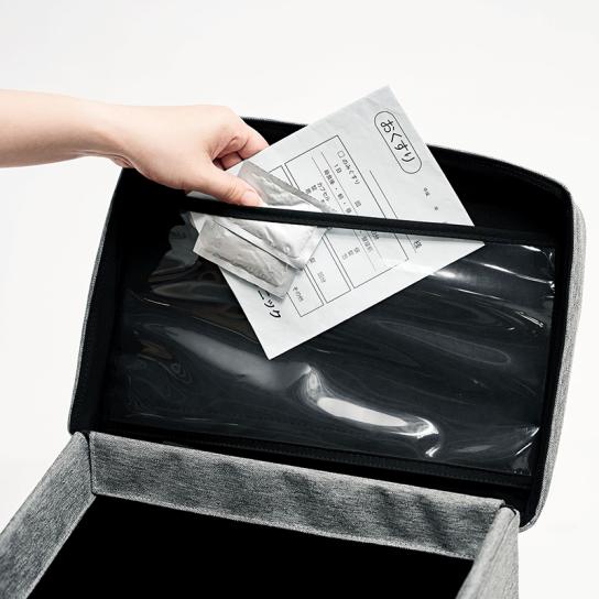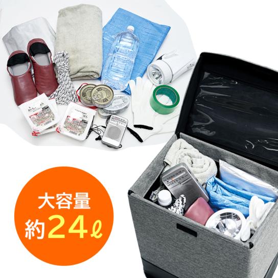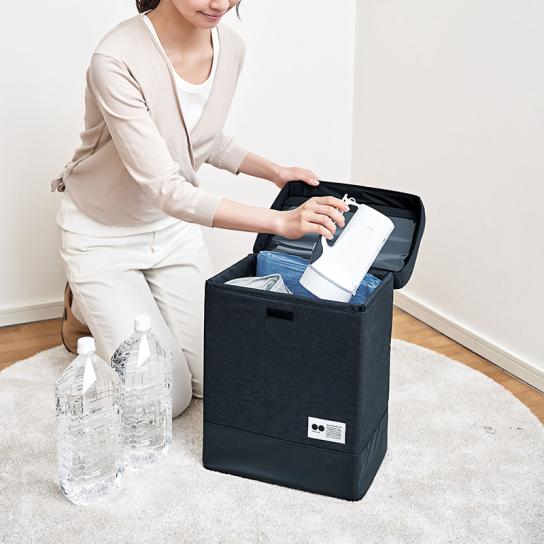 おしゃれな見た目だけれど、実は防災バッグ。インテリアにすっきり馴染むデザインで、玄関に置いておけるので、いつでもすぐに持ち出せます。
