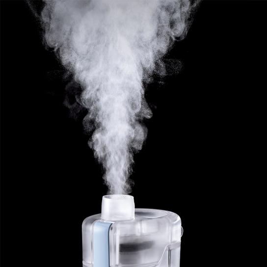 使い方はとっても簡単。フタを開けて水道水を入れたら付属のディスポメッシュをつけてスイッチオン。少し待つとミストが出てくるので、本体を10cmほど離して大きく口をあけながら吸いこみ鼻から吐きます。鼻の中をうるおす場合は、鼻から吸って口から吐いてください。