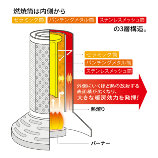イワタニ独自の「熱溜め燃焼筒」(特許第6255311号)を採用。ガスの燃焼パワーを効率よくため込み、スイッチを回すだけで暖かさが広がります。