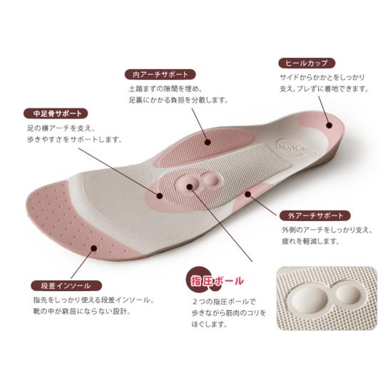 足裏の凹凸に沿う立体形状のインソールに、2つの指圧ボールを配置。歩行時の負担を和らげる構造です。抗菌防臭加工を施し、ゴム素材で滑りにくく、水洗いにも対応しています。