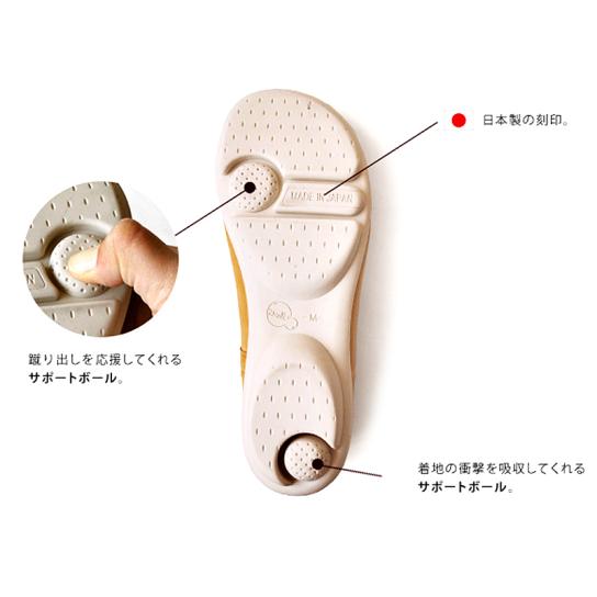 靴底には、着地時の衝撃を吸収するかかとのサポートボールと、蹴り出しをサポートするつま先のサポートボールを配置。ローリングカット設計により、かかとから着地し、つま先へと体重移動しやすい歩行をサポートします。