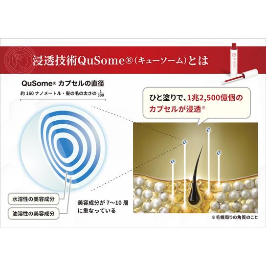 さらに、独自の浸透技術「QuSome(R)(キューソーム)」が有用成分をナノカプセル化。ひと塗りで約1兆2500億個(※)ものナノカプセルがまつ毛と根元に浸透し、長時間とどまりながらゆっくり成分を届けます。