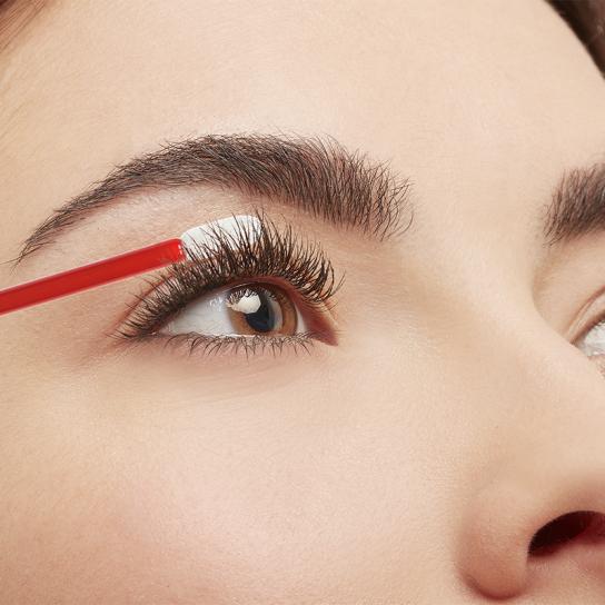 3.チップの斜め部分を使い、根元から毛先に向かってまつ毛を持ち上げるように美容液をなじませます。