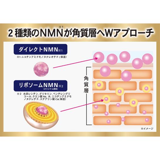 「NMN(※1)」を、肌表面に広がる「ダイレクトNMN」と、リポソームに内包した「リポソームNMN」の2種類で配合。異なるアプローチにより、角質層のすみずみまでうるおいを届けることを目指した処方です。