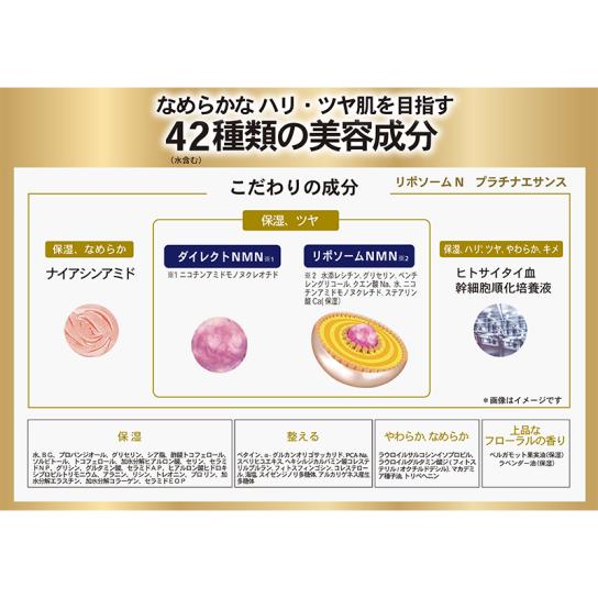 「NMN(※1)」を、肌表面に広がる「ダイレクトNMN」と、リポソームに内包した「リポソームNMN」の2種類で配合。異なるアプローチにより、角質層のすみずみまでうるおいを届けることを目指した処方です。