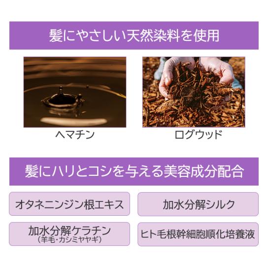 ログウッド、ヘマチンなどの天然由来色素をはじめ、オタネニンジン根エキス、Wケラチン(羊毛・カシミヤ)、シルク、アルガンオイル、椿油などを配合。ヒト毛根幹細胞順化培養液を含む美容成分が髪にハリやコシを与え、若々しい印象へと整えます。